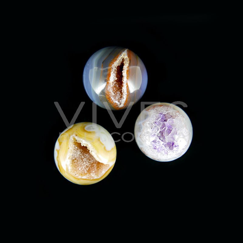 Agate in its natural state usually occurs as inclusions within ovoid or spherical cavities of volcanic rocks. When an agate geode is opened, crystallizations of quartz, amethyst or calcite usually appear inside.