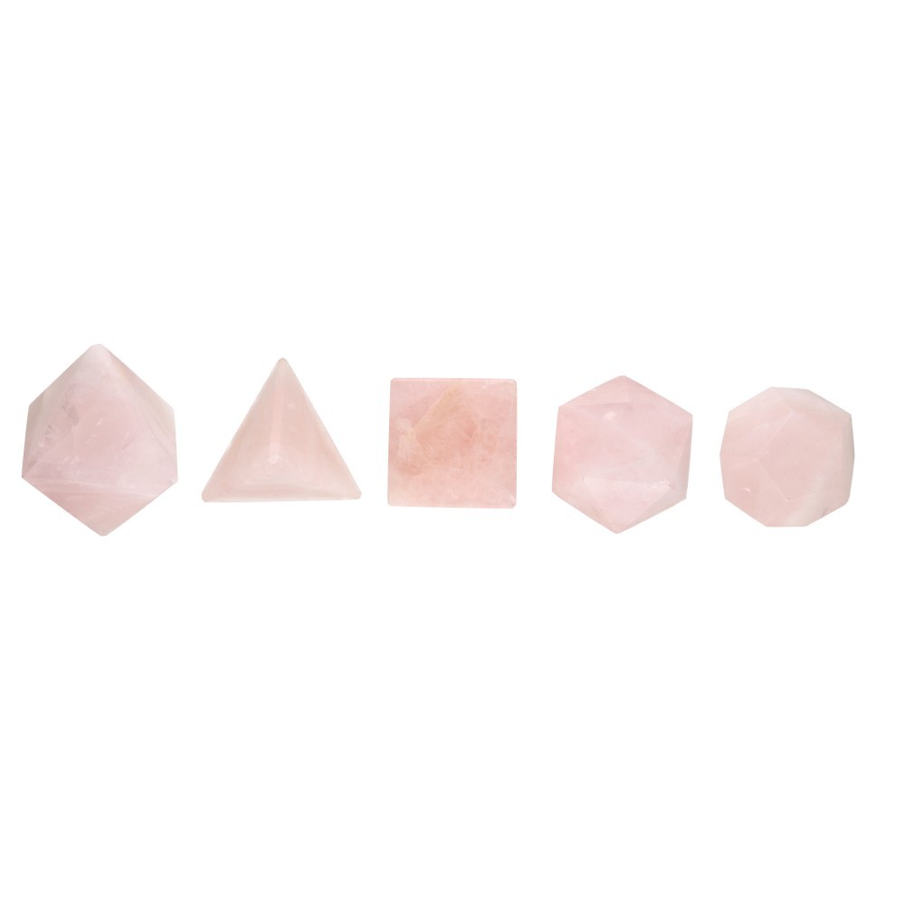 platonic Shapes in Rose Quartz" Set Set of 5 carved minerals representing the 5 platonic forms or elements: Tetrahedron (Fire), Cube (Earth), Octahedron (Air), Dodecahedron (Spirit), Icosahedron (Water) Approximate size of the platonic shapes: 4x4cm The pieces that will be delivered are similar to those in the photographs"