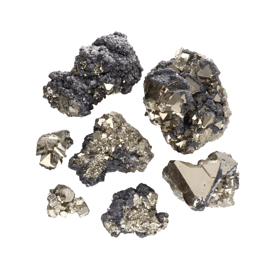 Pyrite belongs to the sulfide group and is a great source of sulfur and iron. It is insoluble in water and magnetic when heated. Its most common form is in cubes, octahedra and pentagonal dodecahedra. It is usually found in massive, granular, nodular or botroidal form.
